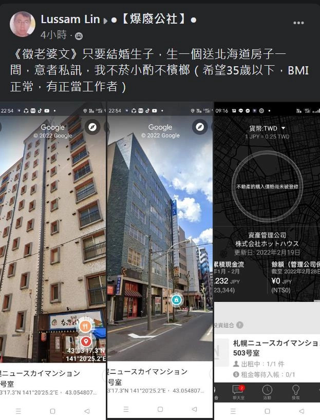 ▼伍男8日又po出2張日本北海道的樓房外觀圖,並說:「《徵老婆文》只要結婚生子,生一個送北海道房子一間,意者私訊,我不菸小酌不檳榔(希望35歲以下,BMI正常,有正當工作者)。」
