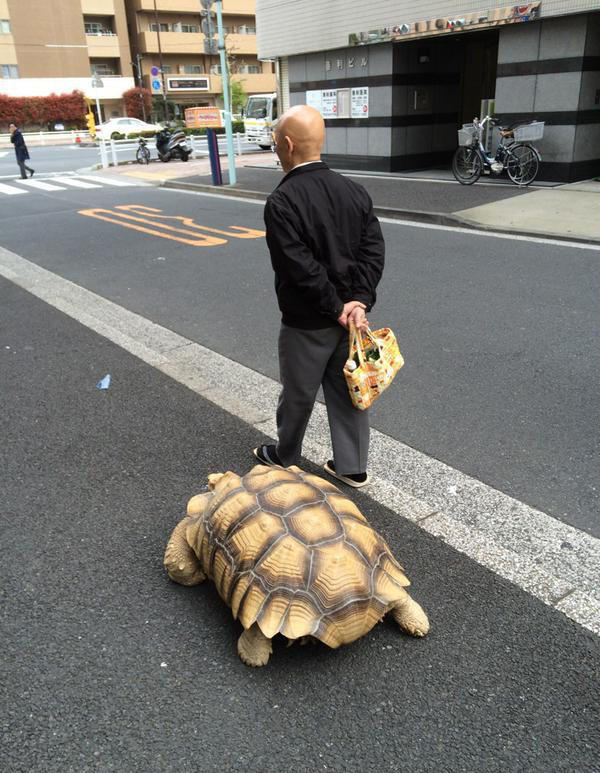 沒想到在東京也會看到這樣的奇景,「一人一龜」在街頭漫步的畫面真的好療癒!如果你有機會去東京,說不定也可以遇到他們喔!