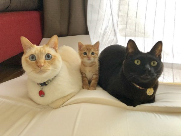 2022年04月13日家有三隻可愛小喵的日本網友,經常在推特帳戶「 イチそらあめ」上分享三小隻的日常照片,牠們每天朝夕相處親密無間,不知情的人還以為牠們已經在一起生活了好幾年,但其實最小的那隻咖色小貓是今年5月初才來到家裡的流浪貓,沒想到很快就和同屋的兩隻大貓玩成了一片。