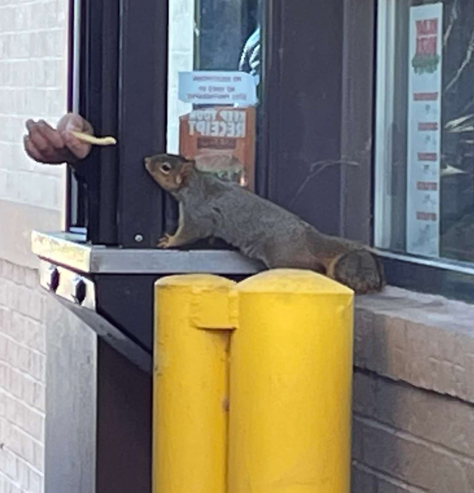 2022年04月18日日前國外網友Jeff Clutch開車到漢堡王得來速,準備買東西吃。當他排隊等點餐時,竟看到點餐窗口旁有一隻小松鼠。Jeff連忙搖下車窗,想看看這隻松鼠到底要幹什麼。沒想到店員竟從點餐窗口伸出一隻手,遞給松鼠一根薯條。原來這隻松鼠也是來點餐的~