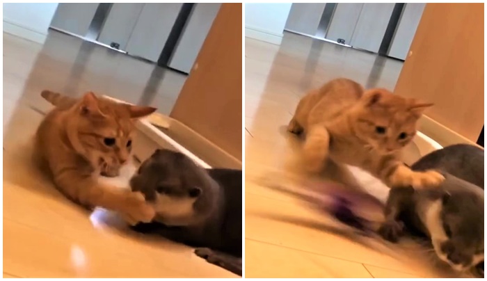 貓咪同化太強!水獺一起玩竟「越來越像貓」 兩隻搶逗貓棒同步趴:預備備~