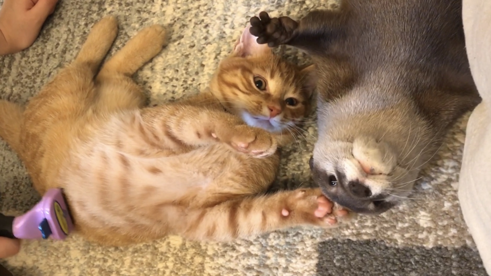 推主看到貓咪、水獺一起玩逗貓棒的模樣,忍不住笑說:「這是養了2隻貓咪嗎?」牠們的動作、反應一模一樣,簡直太可愛啦!