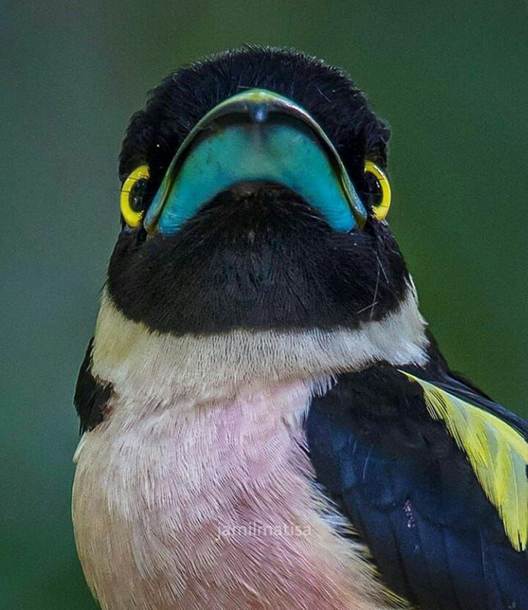 ▼這種鳥是「黑黃闊嘴鳥」,牠們主要生活在東南亞、泰國、印尼和周邊國家。只看牠的側臉,你可能覺得這是一種美麗優雅的鳥兒,但看看正面…終於明白牠為什麼是「闊嘴鳥」了。