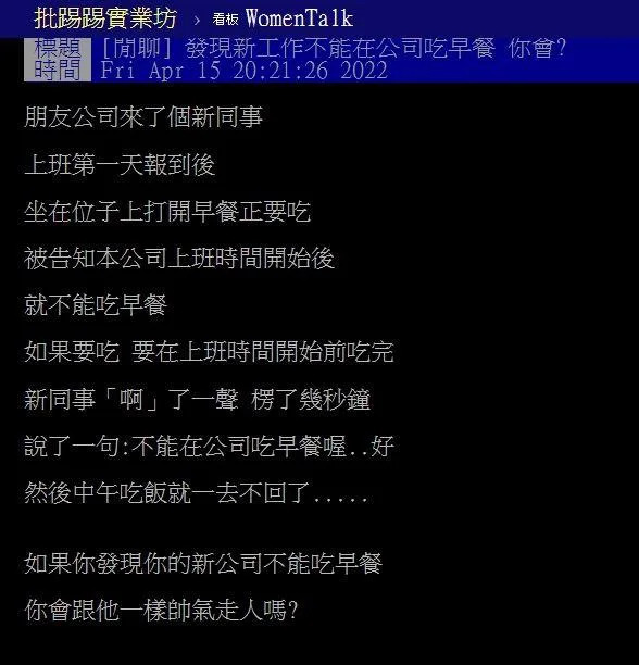 2022年04月21日早餐是一天的活力之源。日前一名網友在PTT的WomenTalk板以「發現新工作不能在公司吃早餐,你會?」為題發文,表示朋友的公司來了一位新同事,上班第一天準備在公司吃早餐。但這名新人得知公司規定不能在上班時間吃早餐後,竟在吃完午餐後一去不回,這讓原po相當傻眼。