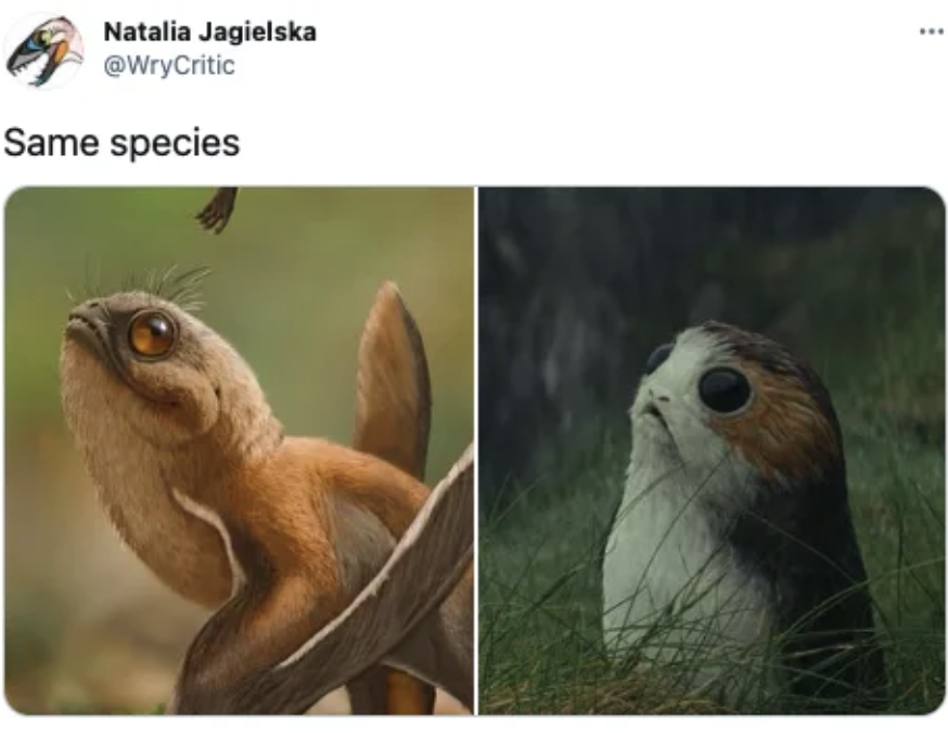▼插畫家Jagielska開玩笑說,中華大眼翼龍跟《星際大戰》中的可愛生物「波波(Porg)」是同一品種。