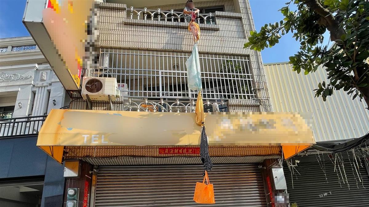 ▼從照片中可以看到,那名顧客站在3樓陽台,手中拿著一條用許多衣物綁成的繩子,最下端則綁著一個橘色的袋子。等外送員將餐點放進袋子裡,她再提上去。
