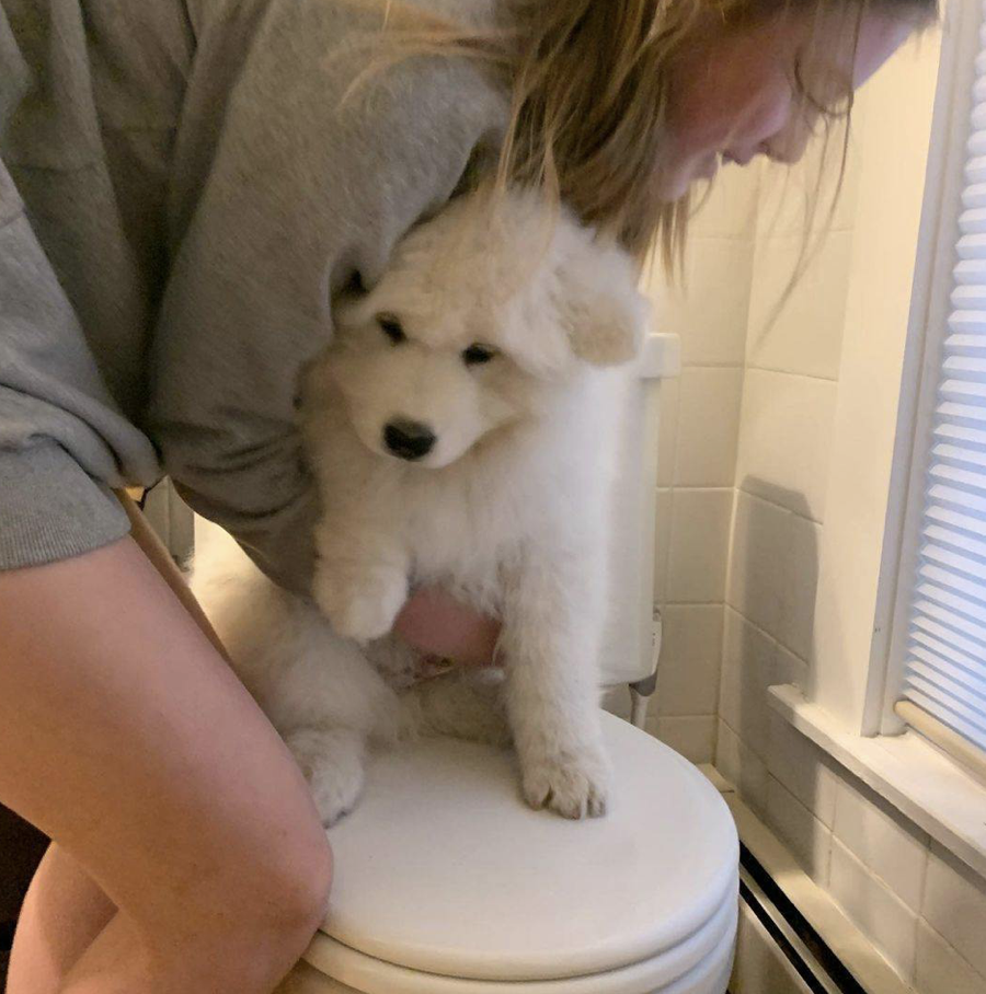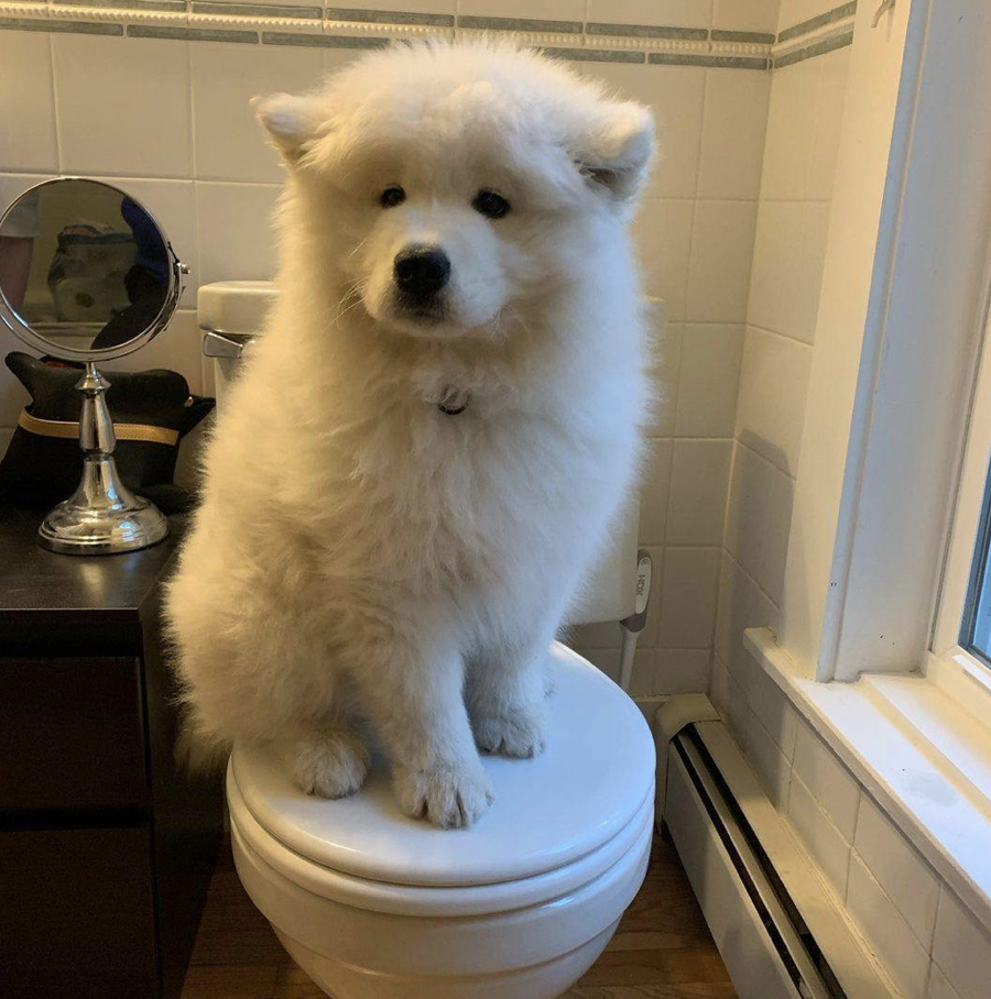 想學主人蹲馬桶上廁所 小薩摩耶「不知掀馬桶蓋」呆坐:然後捏~