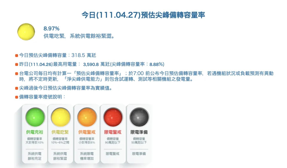 2022年04月27日本土疫情持續升溫,居家隔離的人數不斷增加,還有很多學生開始居家上課、上班族也開始分流上班,導致用電量大增。全台電力備轉容量率在26日傍晚6時以後掉到2%,台電險些進入限電作業。今天(27日)備轉率也只有8%,預計太陽下山之後會降至3%。台電內部人員坦言:「本週恐怕很難過,要非常小心。」