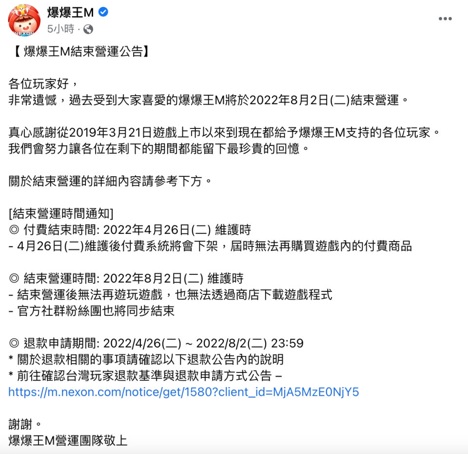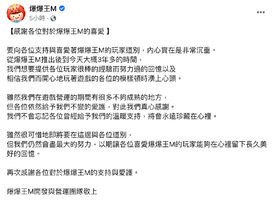 ▼「爆爆王M」於4月底在臉書專頁發文說:「爆爆王M將於2022年8月2日(二)結束營運。 真心感謝從2019年3月21日遊戲上市以來到現在都給予爆爆王M支持的各位玩家。 我們會努力讓各位在剩下的期間都能留下最珍貴的回憶。」