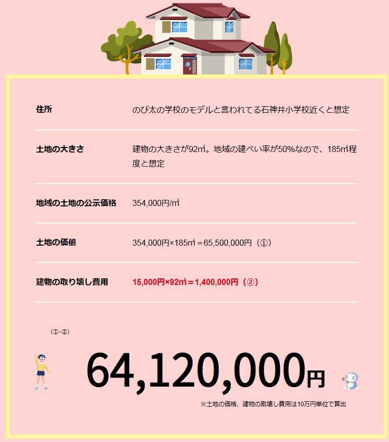 ▼雖然這些建築物已經不值錢,但它們所在的土地可不便宜。專家大概估算了一下,哆啦A夢家的土地大約值6400萬日圓。