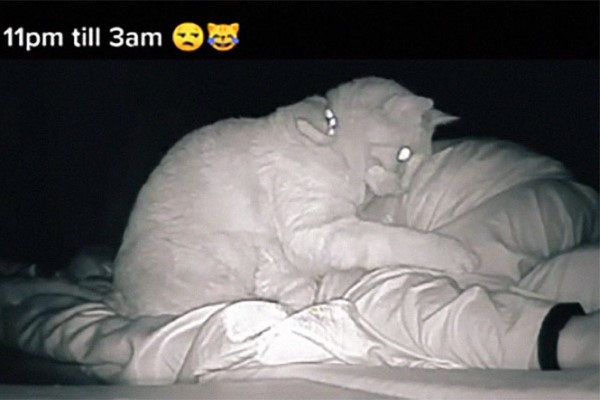 ▼從監視器畫面中可以看到,Ginger在晚上11點左右走進臥室,跳上床拍打Susie或拉棉被。牠會蹲坐在Susie旁邊,一直這樣做到凌晨3點。Susie猜測,Ginger可能是想要討抱抱,這才騷擾自己的。牠希望家人醒來陪牠一起玩。