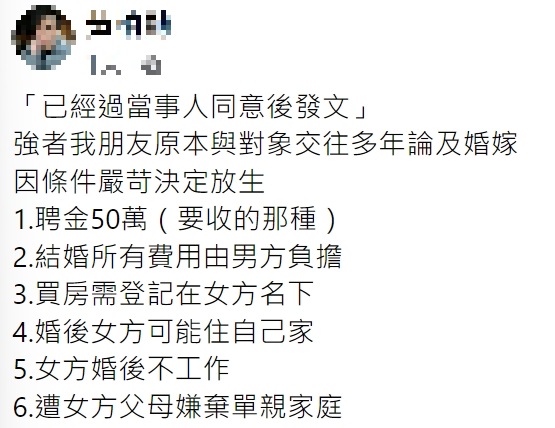 原po表示,朋友和女友交往多年,兩人已經論及婚嫁,但最後還是以分手告終。因為女方要求50萬元的聘金、男方負擔結婚所有的費用、買房需登記在女方名下、婚後女方可能住自己家、女方婚後不工作,女方的父母還嫌棄男方是單親家庭。