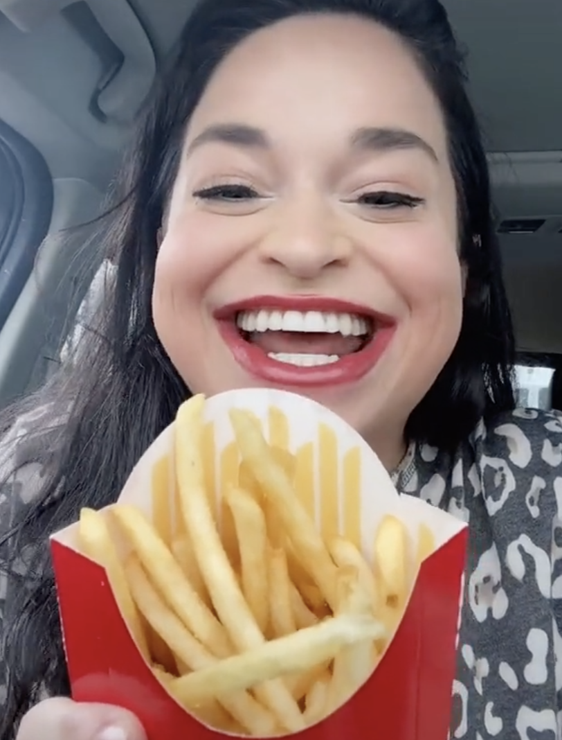 ▼Samantha挑戰一口吞下麥當勞大包薯條: