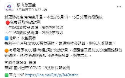 松山慈惠堂10日在臉書發布公告稱,因為現在疫情持續升溫,因此暫停今年的母娘文化祭及小巨蛋遶境活動,並提撥出部分經費,從韓國購買多劑基因巴帝(GenBody)居家用抗原快篩試劑,無償提供民眾領用。