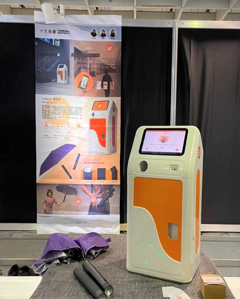 ▼樹德科技大學生活產品設計系老師陳文亮與學生曾微茵、張競文、陳亞暄發明的「傘具產品租賃裝置及服務系統」作品,讓雨傘也能租賃。租賃裝置可放置傘具數量,將不再受面板的影響,讓物品商業價值達到最大效益。這一作品以「共享經濟」觀點拿到一面金牌。