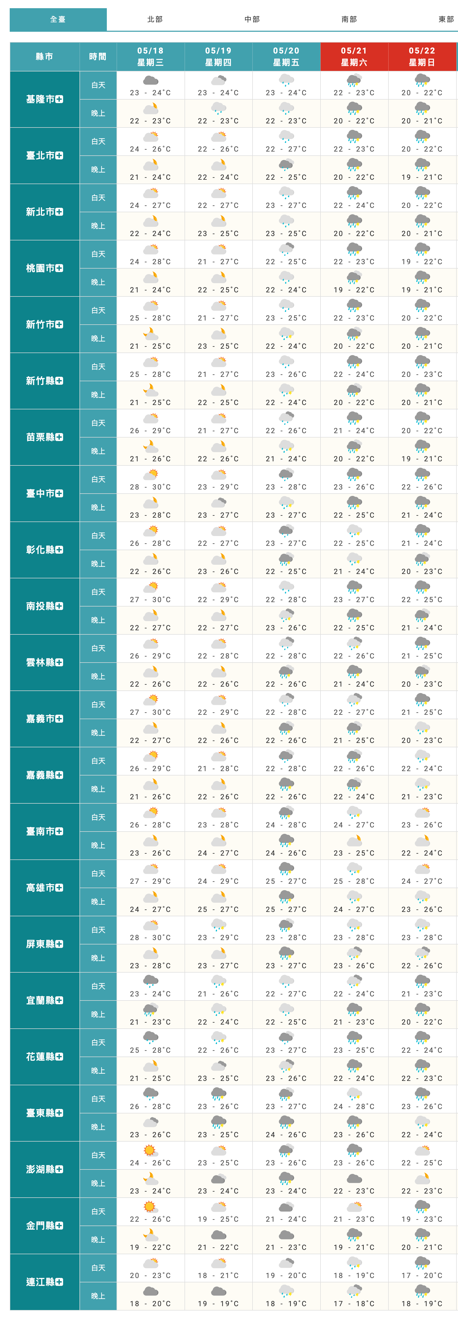 ▼這種天氣會延續到下週二(24日),雨區轉為以迎風面北部及東半部地區的短暫陣雨為主,其他地區亦有短暫陣雨但較為局部。下週二開始,環境轉東風,南方來的水氣增加,東半部及南部地區有局部短暫陣雨或雷雨,其他地區為多雲,午後有局部短暫雷陣雨。