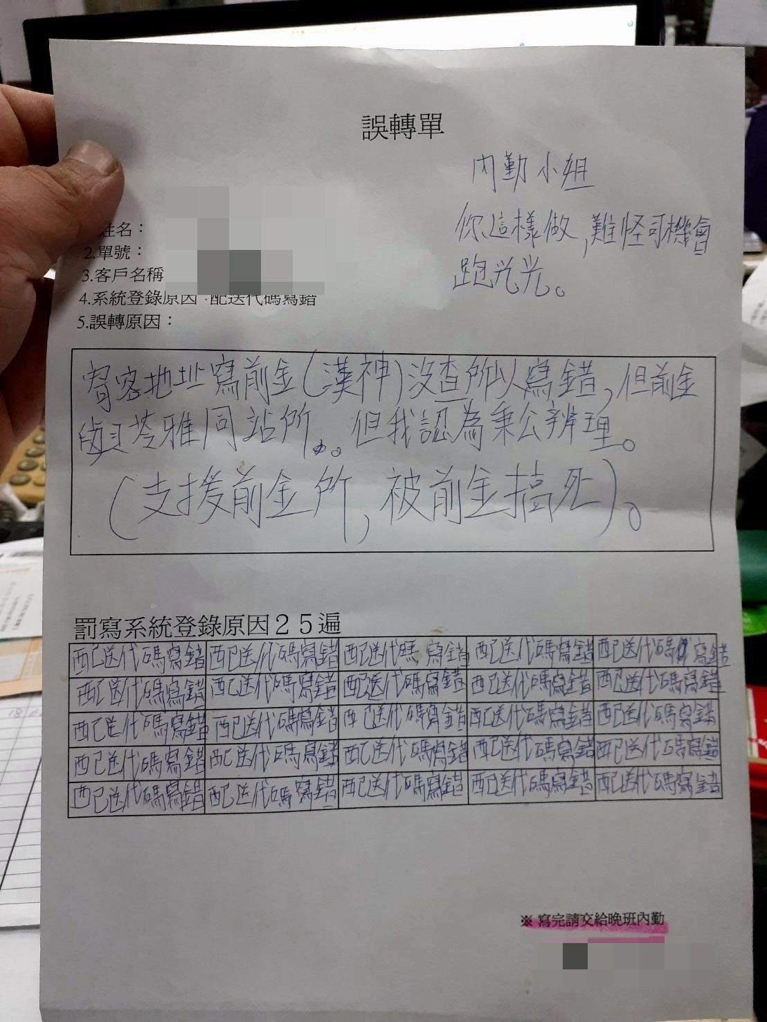 ▼這名司機因為配送程式碼寫錯,被罰寫25遍。他無奈喊冤:「前金與苓雅同站所,支援前金所,被前金搞死。」原po則表示:「這公司到底是哪裡有問題?宅配司機已經在外面一整天了,回來還要罰寫作業,一個郵遞區號搞得那麼複雜,前金區都不前金了!」