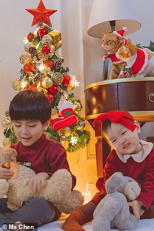 ▼陳小姐經常在網路上分享毛孩們和小孩的甜蜜互動,5隻貓咪陪妹妹睡覺的影片也引發關注: