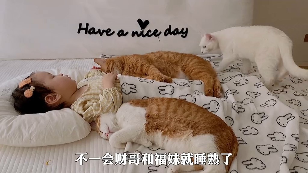 ▼在旁邊互相理毛的橘貓「財哥」和白貓「七七」看到這一幕,也跑過來加入陪睡的行列。因為福妹和財哥佔據了妹妹的手臂,七七只好選擇挨著財哥睡下。