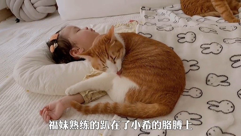 ▼貓咪們跟小希感情深厚,那天小希睡午覺時,貓咪們也跟了過來。牠們原本各自在旁邊理毛、休息,看到妹妹躺在床上睡著了,橘白貓「福妹」主動跑過來,熟練地窩在妹妹的手臂上,要跟她一起睡。