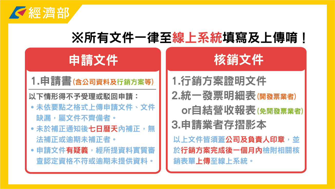 民眾可採用「線上申請」方式,事先得準備申請書(含公司資料及行銷方案等),以及「核銷文件」,包括行銷方案證明文件(包含優惠日期及內容等項目)、統一發票明細表(開發票業者)或自結收報表(免開發票業者),以及申請業者存摺影本。