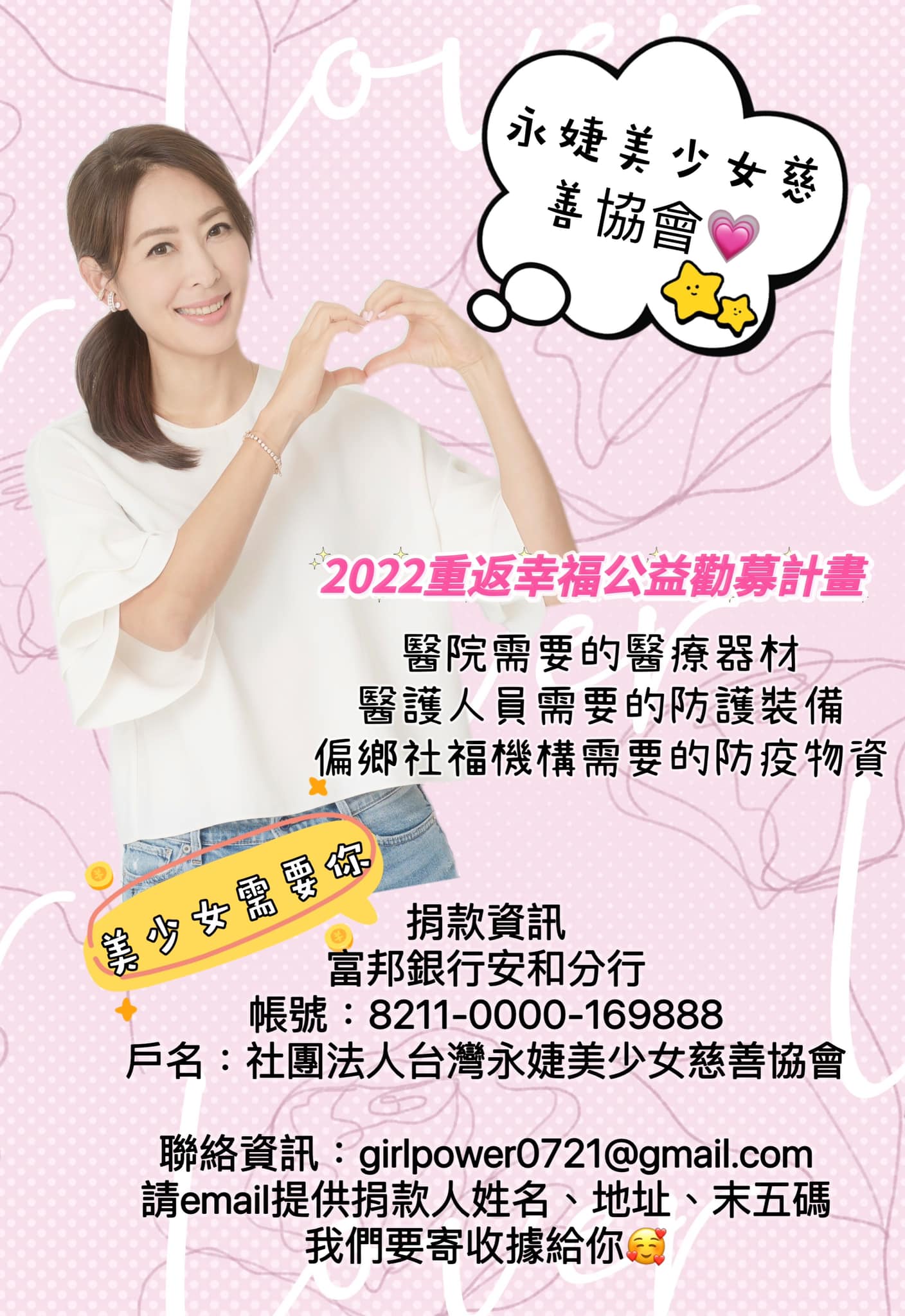 賈永婕近日開始捐贈醫療器材,並成立慈善協會、設立捐款帳號,開放接受民眾捐款。她在臉書發文說,下一步將捐贈醫療器材到偏鄉地區,更喊話「有需要的單位也可以跟我聯繫」。這則貼文引發大批網友按讚,有人留言說「衛福部長換人了,還是妳比較適合」。賈永婕則謙虛回應:「相信我我真的沒有這個能力。」