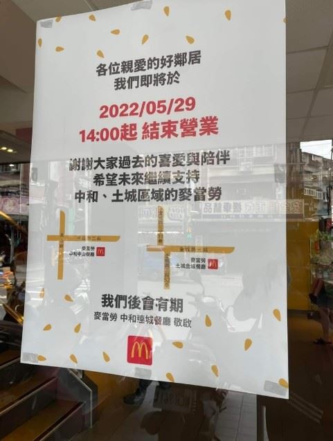 2022年05月31日麥當勞餐點選擇多樣、出餐十分迅速,一直以來都是台灣速食界的龍頭。不過有10年歷史的麥當勞「中和連城分店」日前宣布結束營業,令人非常不捨。一名網友在臉書社團「我是中和人」po出一張照片,只見門口貼有一張公告,上面寫著:「營業到5月29日下午14時,感謝大家過去的喜愛與陪伴,希望未來繼續支持中和、土城區域的麥當勞!」