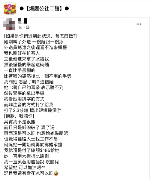 ▼原po坦言,其實那碗麵只是紙碗破了、漏了湯,食物仍可以吃,而且她還點了一碗雪花冰,不至於餓肚子,「我一直笑著用唇語說沒關係,想給他鼓勵吧,覺得聾啞人士找工作不容易,更何況他一開始就勇於認錯承擔,希望他可以加油」。