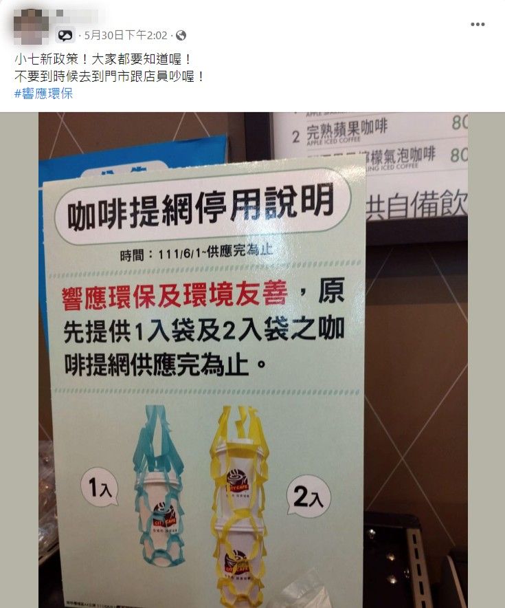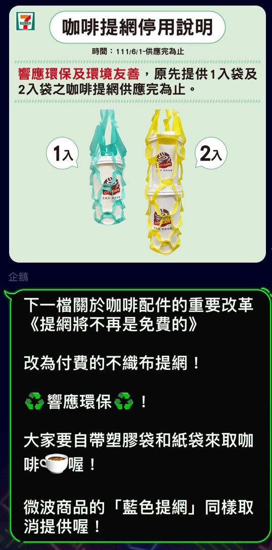 ▼還有7-11店員在Dcard上爆料說,原先打算不再提供免費的咖啡提網,改為全面收費的不織布提網,並通知門市6月1日開始立牌提醒,沒想到5月31日又緊急通知,「叫大家先把立牌撤掉,改不主動提供咖啡提網」。