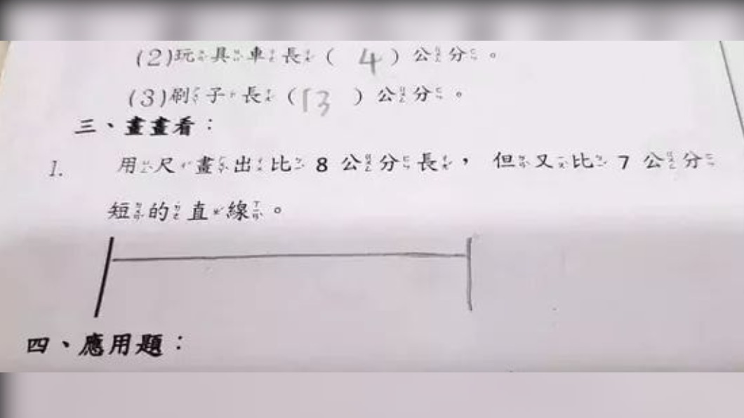 2022年06月07日小朋友的作業看似簡單,卻經常難倒大人。日前一名網友分享,有一道小學生的數學題,要求學生拿尺畫出一條「比8公分長,但又比7公分短的直線」。她忍不住質疑,真的有這種線存在嗎?這一話題引發討論,網友們看到後忍不住笑說:「現在的教學都是腦筋急轉彎嗎?」