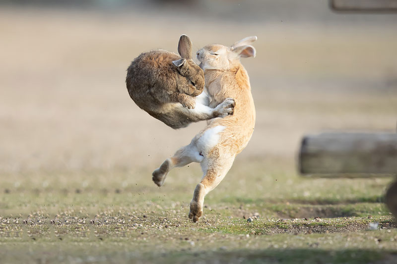 ▼從照片中可以看到,這2隻兔兔騰空而起,其中一隻踢腿發動攻擊,另一隻則後退防禦。攝影師捕捉到這珍貴的瞬間,把牠們勢均力敵的對抗拍攝了下來,一眼看去就像電影中的武打戲,充滿力量和美感