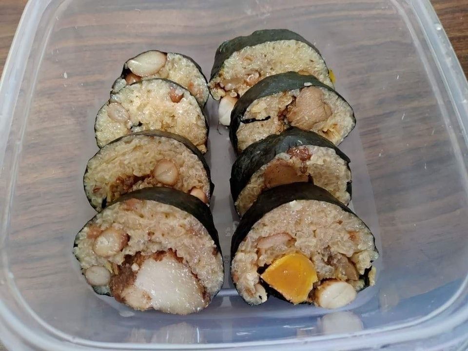 ▼從原po貼出的照片可以看到,便當盒內的壽司非常特別,海苔內包著粽飯,還有花生、蛋黃,根本就是油飯包海苔!原來媽媽並沒有另外做壽司,而是把肉粽改做成了壽司。