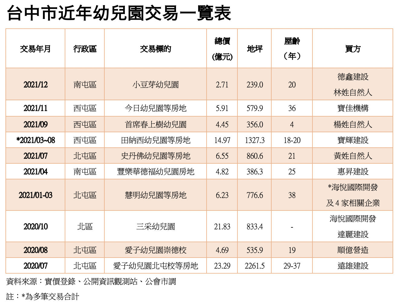 2022年06月10日近年來屢屢傳出幼兒園被收購的消息,而且每筆金額都衝破億元大關。根據統計,台中短短1.5年,在原台中市範圍內就有10間幼兒園易手,而且絕大多數為建商獵地,合計8156坪土地,總交易金額來到95.45億元。台灣房屋集團趨勢中心資深經理陳定中表示,台中鬧區的大型土地資源稀少,所以業者才從獵地轉向幼兒園獵屋,原因就是「地段精華、佔地廣大、產權單純」。
