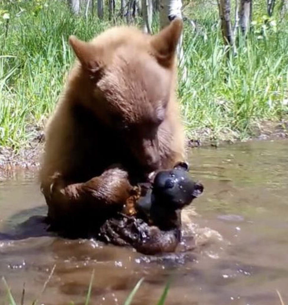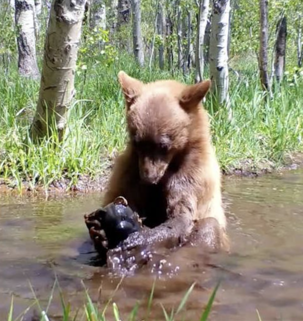 2022年06月16日去年時,救援人員從北加州的一個野火區救出一隻孤兒小熊Tamarack,牠的熊掌不小心被燒傷,因此被送到照護機構治療,不過Tamarack很快就逃回野外了。不久前攝影鏡頭捕捉到了Tamarack的身影,牠竟抱著一個黑熊玩偶在水坑中洗澡,那一幕非常有趣~