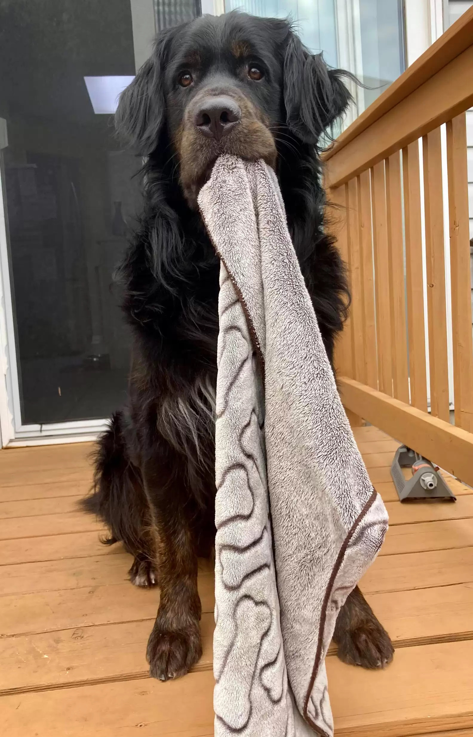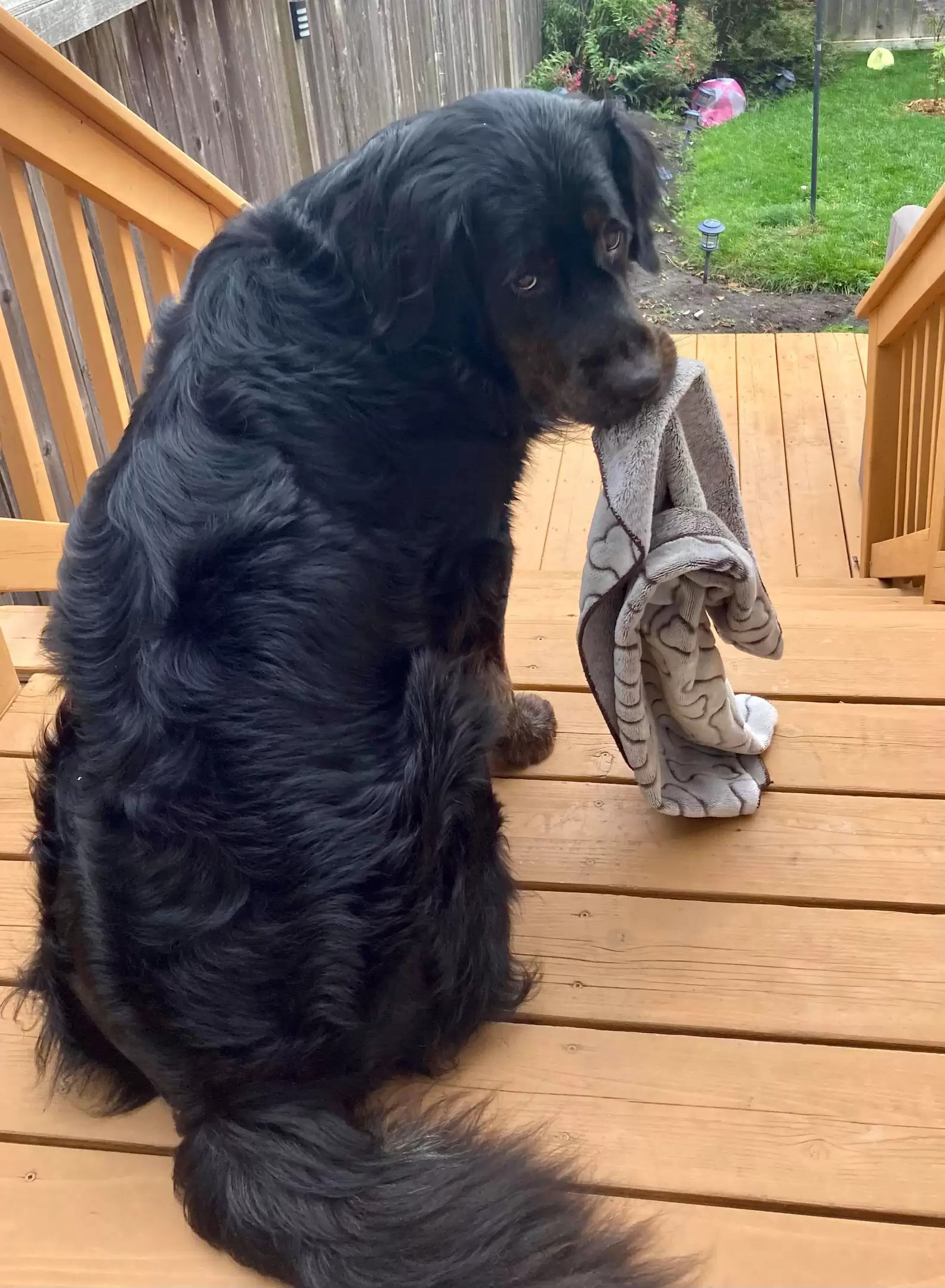▼每天早上Flynn起床後,做的第一件事就是叼著小毛毯到院子裡散步、看風景。Shauna見愛犬這麼喜歡這條小毛毯,就去商店多買了幾條,準備拿來換洗、備用。