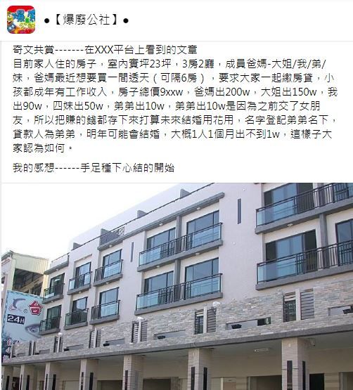 2022年06月27日房子是很多家庭財產分配的導火線之一。日前一名網友在臉書社團「爆廢公社」分享一篇貼文,文中敘述父母想要換房,要求全家人一起繳房貸,但房產分配的方式卻令人傻眼。網友們看到後忍不住直呼:「這爸媽是不是很想要手足相殘?」