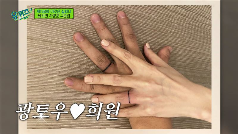 ▼具俊曄在節目上示範自己於視訊通話中向大S單膝下跪的求婚場面,還透露「熙媛提議如果結婚的話,我們的婚戒就用刺青代替吧」,他秀出自己手上的婚戒刺青,還曬出他和大S兩手交疊的刺青照。