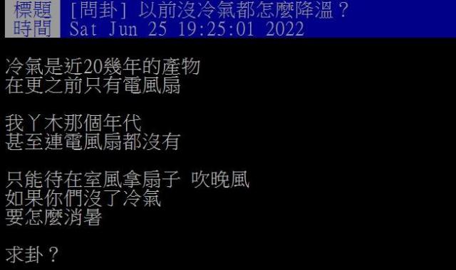 ▼一名網友在PTT發文說:「冷氣是近20幾年的產物,在更之前只有電風扇,我丫木那個年代甚至連電風扇都沒有,只能待在室風拿扇子、吹晚風。如果你們沒了冷氣要怎麼消暑?」