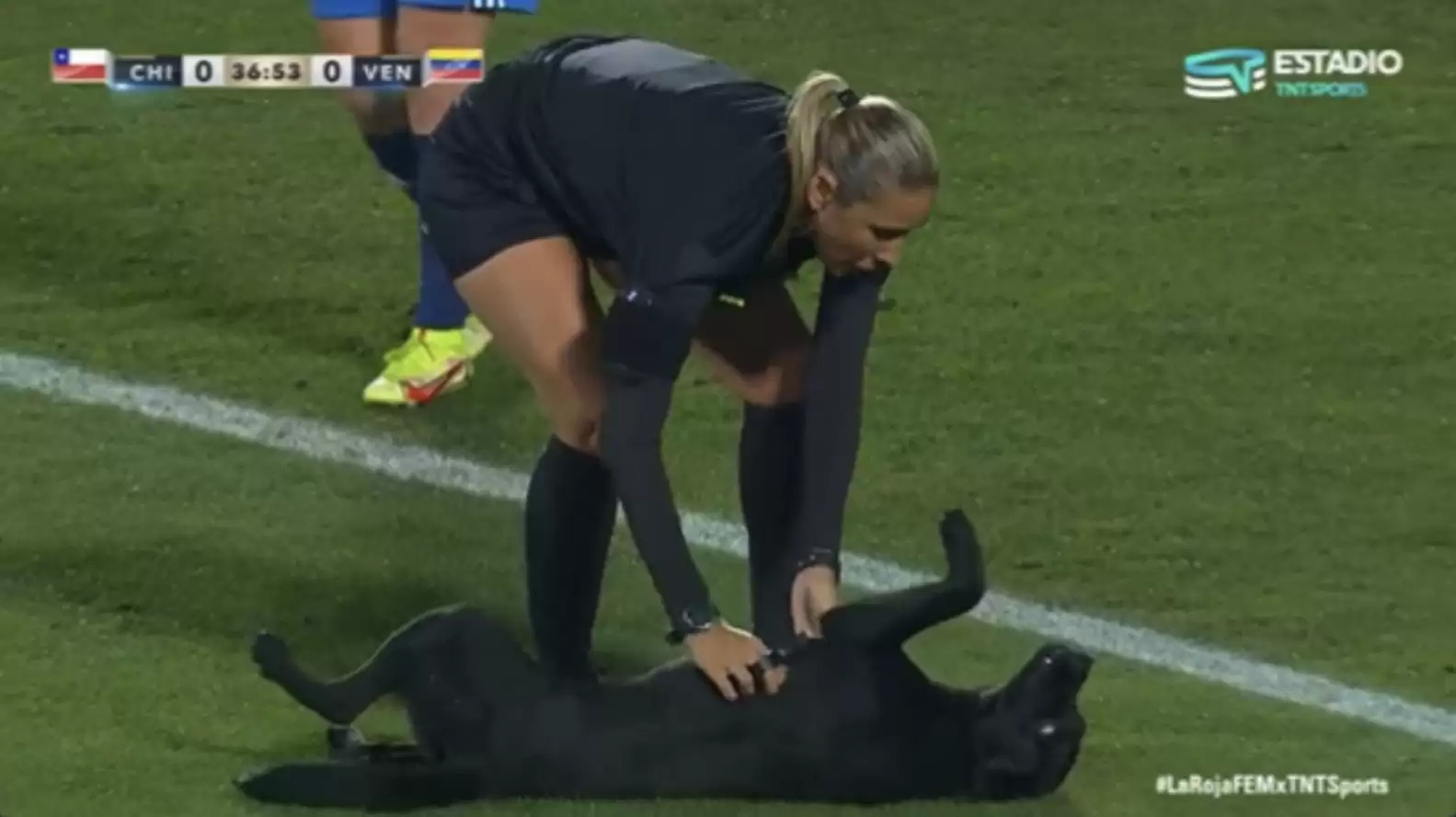 2022年07月13日牠才是全場最佳!智利與委內瑞拉國家女子足球隊26日在庫里科的拉格蘭哈體育場進行比賽,沒想到比賽突然被中斷,原來是一隻狗狗闖入賽場。那隻狗狗表現得超興奮,還找上智利守門員翻肚肚討摸,並躺在裁判身邊撒嬌,現場球迷都笑翻了。