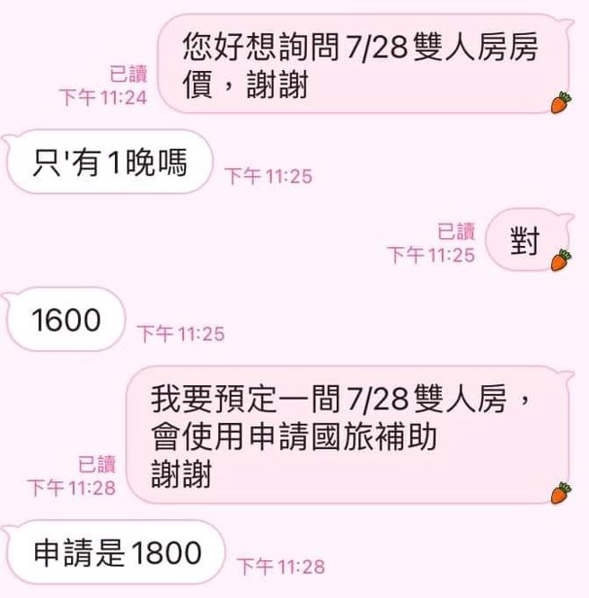 ▼「布萊N 食宿人生」po出一張LINE截圖,只見遊客詢問老闆28日一晚的雙人房房價,老闆回答1600元。後來客人表示會申請國旅補助,老闆竟當場加價,將房價變成1800元,硬生生翻臉漲價200元。「布萊N 食宿人生」氣憤說「店家直接不演說要加價,遇到這種無良店家麻煩大家抵制起來」,並透露這間民宿位於澎湖。