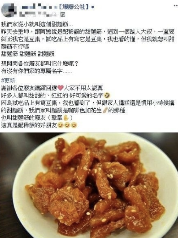 ▼這名女網友在臉書社團「爆廢公社」po出一張照片,並發文說:「我們家從小就叫這個是甜麵筋!」之後她跟阿嬤提到,這是配稀飯的甜麵筋,結果一位路人大叔一直糾正說,這個「褐色的東西」叫做「豆棗」。原po無奈表示:「我就想叫它甜麵筋不行嗎?」
