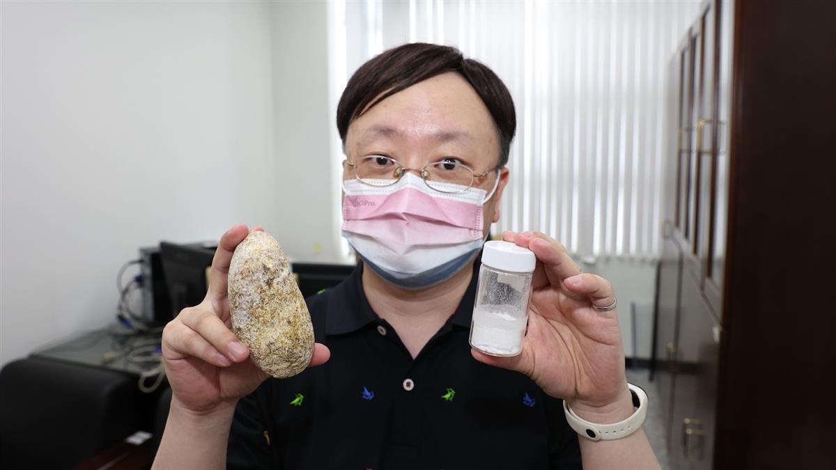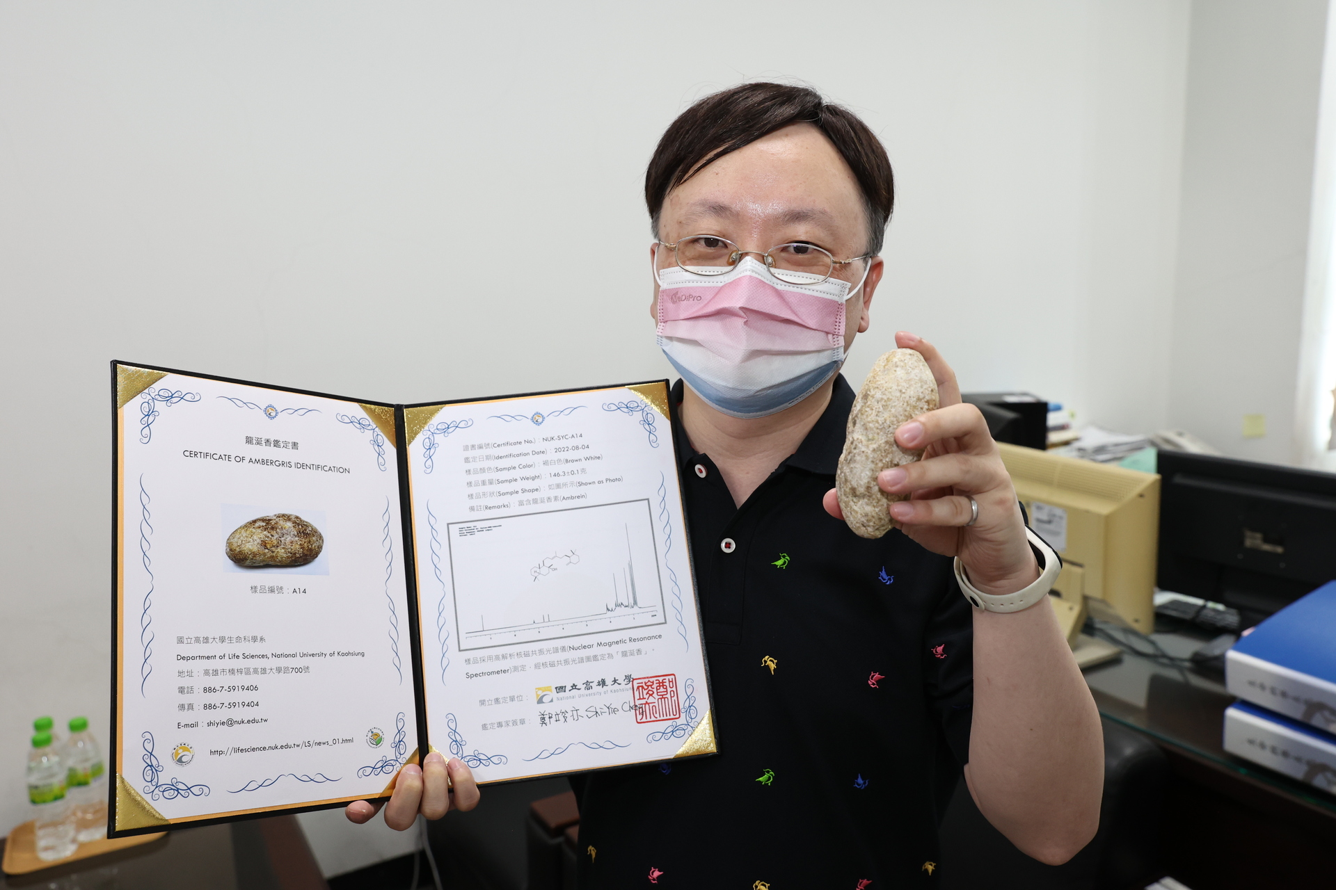 ▼這塊龍涎香為白色、呈現鵝卵石狀外觀,重約146公克,湊近能聞到特別香味。高雄大學生命科學副教授鄭竣亦,利用「核磁共振光譜(Nuclear Magnetic Resonance Spectroscopy – NMR)技術」,從NMR圖譜中發現「龍涎香素」專屬訊號,確定柯先生拾獲的是真品無誤!