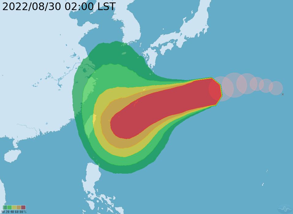 2022年08月30日中央氣象局觀測,中度颱風「軒嵐諾」今天(30日)凌晨2時近中心最大風速每秒48公尺,已來到中颱上限。它的強度比今年過去10個颱風都要強,預估今天將增強為強烈颱風。明晚起(31日)北部轉為有局部短暫陣雨,週四至週六(9月1日至3日)最靠近台灣。