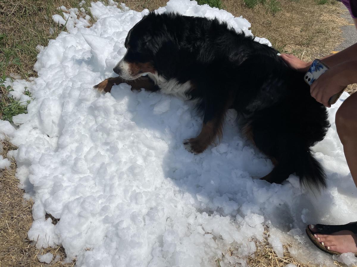 ▼這則貼文很快引發討論,當地溜冰場「Bowness Sportsplex」的工作人員看到後,馬上聯繫飼主,並運來一車碎冰在他家門口鋪成一個小雪堆。Brooke看到冰涼的雪非常開心,牠在飼主的幫助下爬到雪堆上,慢慢打了兩個滾。這是久違的快樂,Brooke不捨得離開,一直到雪全部融化才回家。