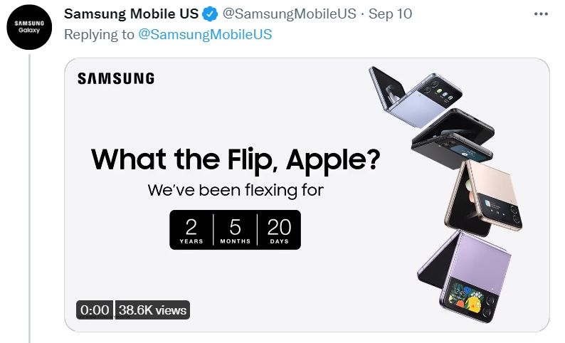 ▼三星於10日在推特上發文和3則影片狂酸蘋果,內文寫道:「來簡單總結一下,我們對於蘋果週三宣布『創新』設備的反應。」影片首先針對摺疊手機:「摺疊手機呢,蘋果?我們推出Flip、Fold系列摺疊機已經2年5個月又20天了。」