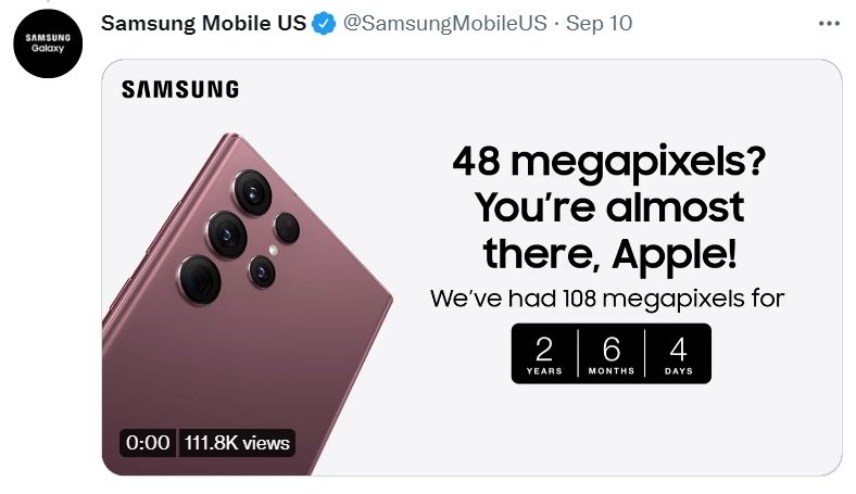 2022年09月13日蘋果剛剛發布的iPhone 14系列令不少果粉感到相當驚艷,紛紛下單預訂,但三星卻不以為意。蘋果發表會結束後,三星連發3篇推文酸新版iPhone沒創意,甚至矛頭直指蘋果引以為豪的4800萬畫素相機鏡頭:「4800萬畫素?我們有1億800萬畫素已經2年6個月了。」