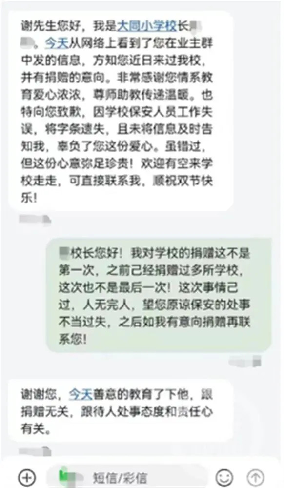 謝先生則給校長回訊息說:「這次事情已過,人無完人,望您原諒保安的處事不當過失,之後如我有意向捐贈再聯繫您!」