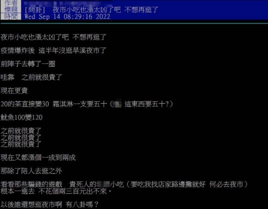 這名網友在PTT上發文說,他前陣子去逛了一圈旱溪夜市,沒想到原本就很高的價格現在變得更高了,20元的茶變成了30元,霜淇淋一支要50元,魷魚從100元變成120元,一下子漲了一成到兩成,進去後不花個兩三百元出不來。他批:「以後誰還想逛夜市啊!」