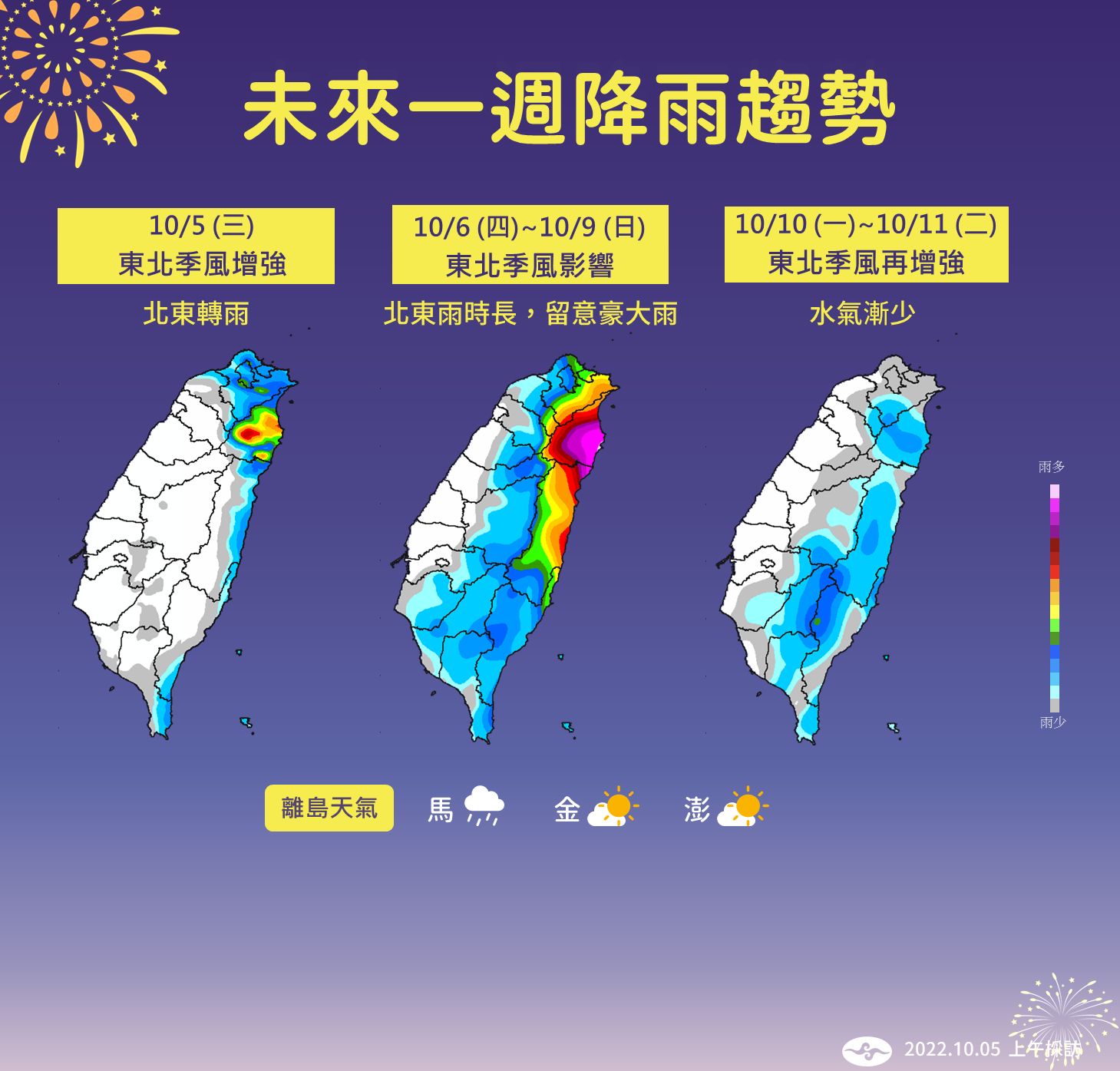 2022年10月06日受東北季風影響,今天(6日)起到週日(9日)水氣較多,降雨機率高,大台北、東北部、東部降雨時間長,雨勢也大。下週一(10日)國慶日以後,冷空氣強度更強,北部、東北部低溫下降至20度,白天高溫也僅剩25度左右。