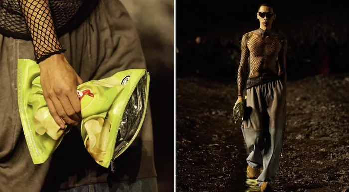 ▼Demna讓模特兒們拿著薯片包走秀。這是巴黎世家與樂事合作推出的包款,共有5種顏色,對應5種不同的口味。外包裝非常擬真,內部則是銀色金屬質感皮革,拿在手上能夠呈現出自然的抓皺效果。